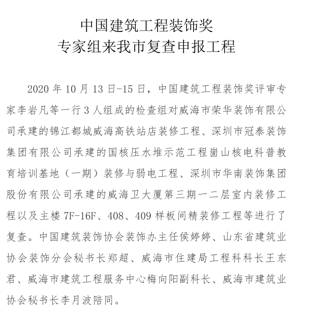 >中國(guó)建筑工程裝飾獎(jiǎng)專家組來我市復(fù)查申報(bào)工程