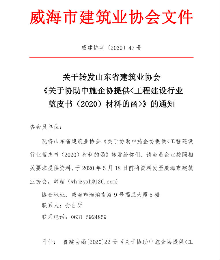關(guān)于轉(zhuǎn)發(fā)山東省建筑業(yè)協(xié)會(huì) 《關(guān)于協(xié)助中施企協(xié)提供<工程建設(shè)行業(yè) 藍(lán)皮書(2020)材料的函>》的通知