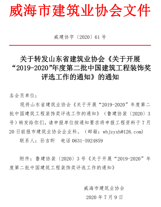關(guān)于轉(zhuǎn)發(fā)山東省建筑業(yè)協(xié)會(huì)《關(guān)于開展“2019-2020”年度第二批中國建筑工程裝飾獎(jiǎng)評(píng)選工作的通知》的通知
