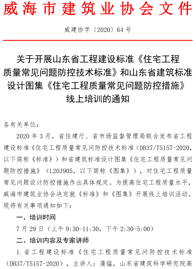 關(guān)于開展山東省工程建設(shè)標(biāo)準(zhǔn)《住宅工程 質(zhì)量常見問題防控技術(shù)標(biāo)準(zhǔn)》和山東省建筑標(biāo)準(zhǔn)設(shè)計(jì)圖集《住宅工程質(zhì)量常見問題防控措施》線上培訓(xùn)的通知