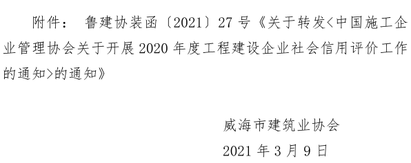 關(guān)于轉(zhuǎn)發(fā)山東省建筑業(yè)協(xié)會(huì)《關(guān)于轉(zhuǎn)發(fā)中國(guó)施工企業(yè)管理協(xié)會(huì)關(guān)于開(kāi)展2021年度工程 建設(shè)企業(yè)信用評(píng)價(jià)的通知》的通知