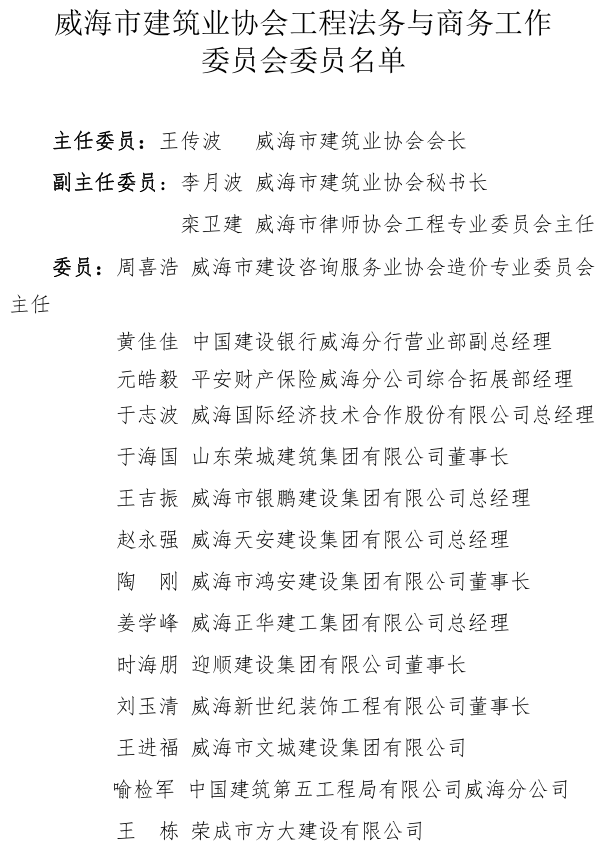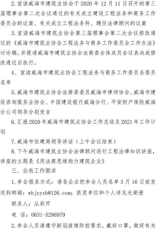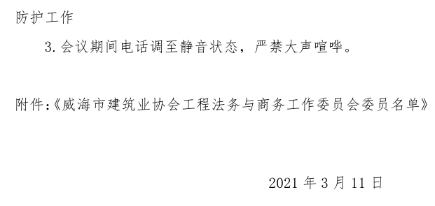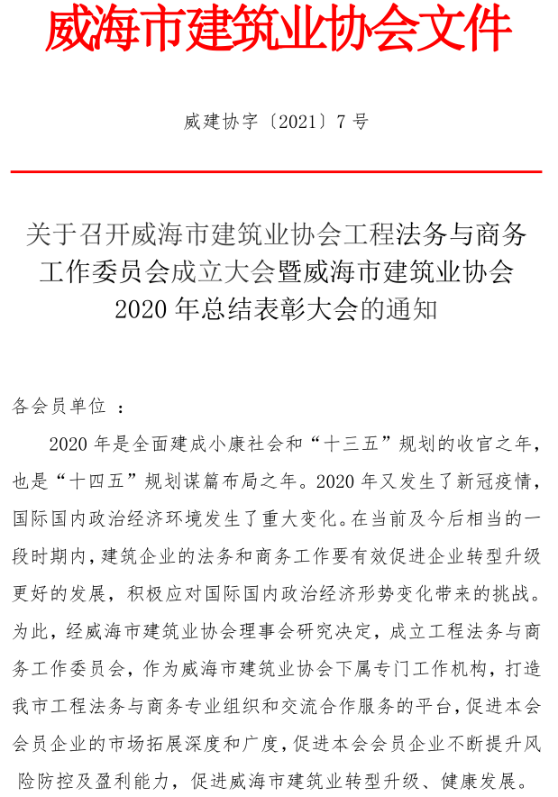 關(guān)于召開威海市建筑業(yè)協(xié)會(huì)工程法務(wù)與商務(wù) 工作委員會(huì)成立大會(huì)暨威海市建筑業(yè)協(xié)會(huì) 2020年總結(jié)表彰大會(huì)的通知