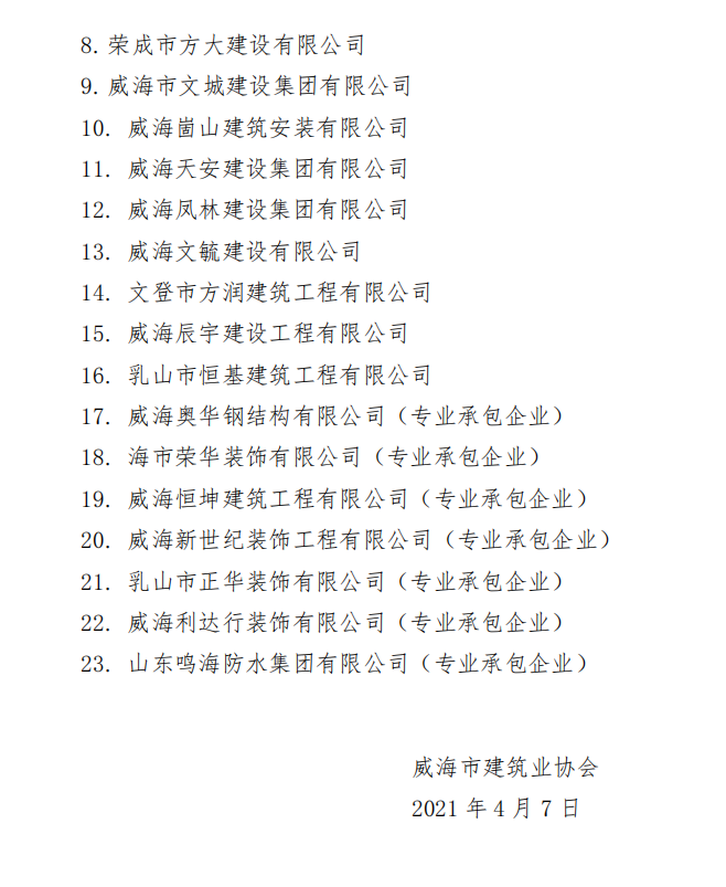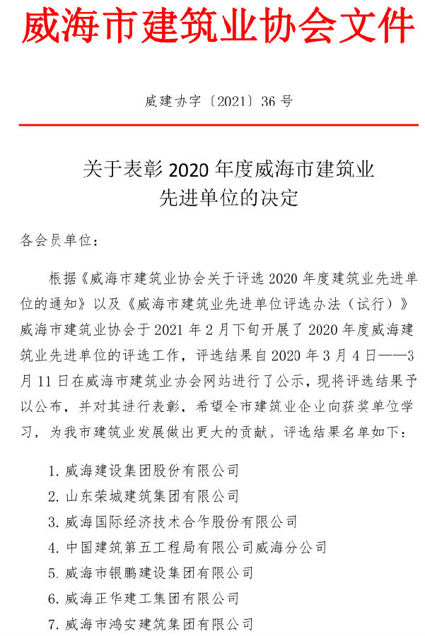 關(guān)于表彰2020年度威海市建筑業(yè)先進(jìn)單位的決定