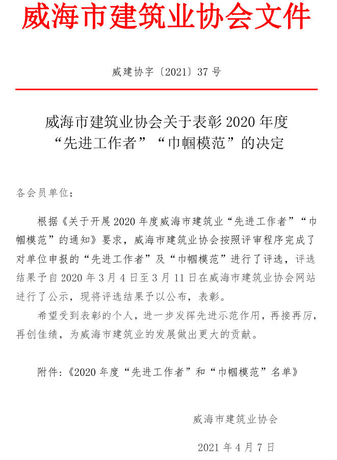 >威海市建筑業(yè)協(xié)會(huì)關(guān)于表彰2020年度 “先進(jìn)工作者”“巾幗模范”的決定