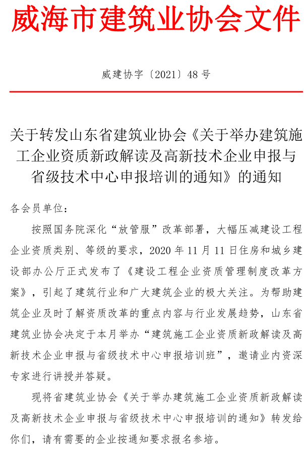 關(guān)于轉(zhuǎn)發(fā)山東省建筑業(yè)協(xié)會《關(guān)于舉辦建筑施工企業(yè)資質(zhì)新政解讀及高新技術(shù)企業(yè)申報與省級技術(shù)中心申報培訓(xùn)的通知》的通知
