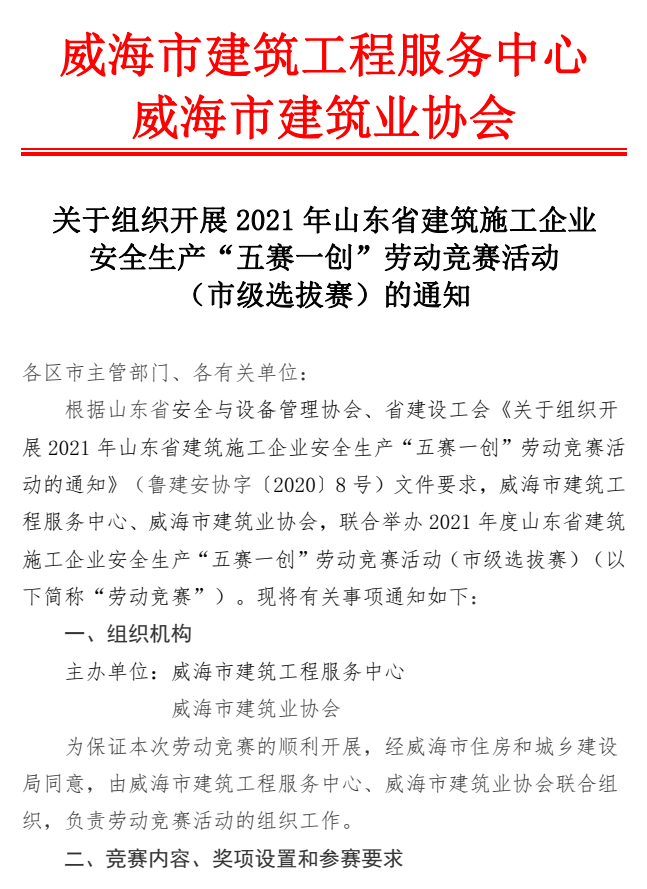 關(guān)于組織開展2021年山東省建筑施工企業(yè) 安全生產(chǎn)“五賽一創(chuàng)”勞動競賽活動 (市級選拔賽)的通知