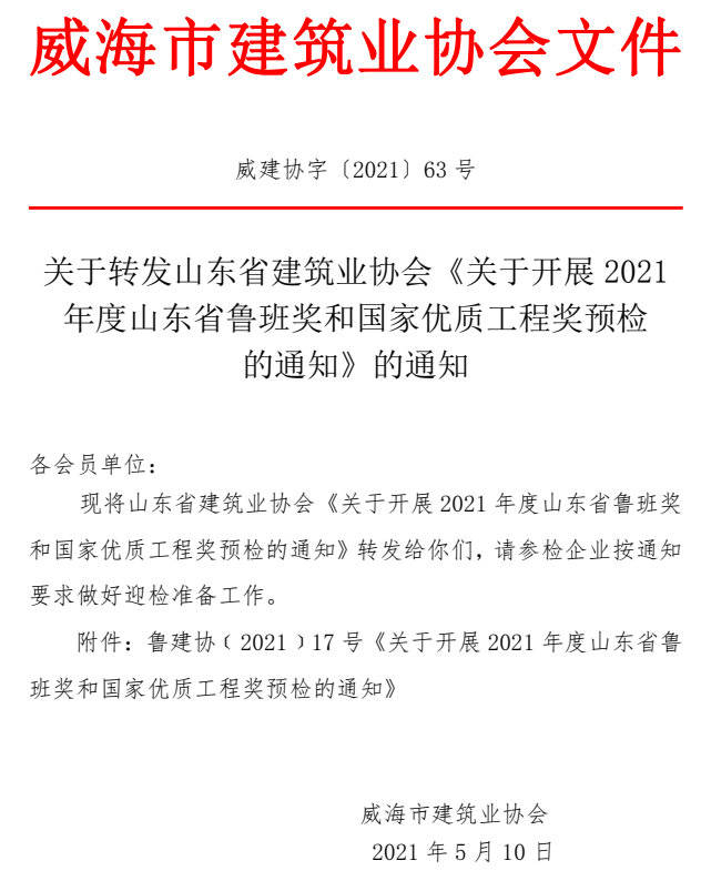 >關(guān)于轉(zhuǎn)發(fā)山東省建筑業(yè)協(xié)會《關(guān)于開展2021年度山東省魯班獎和國家優(yōu)質(zhì)工程獎預(yù)檢的通知》的通知