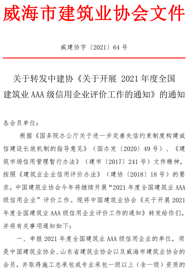 >關于轉發(fā)中建協(xié)《關于開展 2021年度全國 建筑業(yè)AAA級信用企業(yè)評價工作的通知》的通知