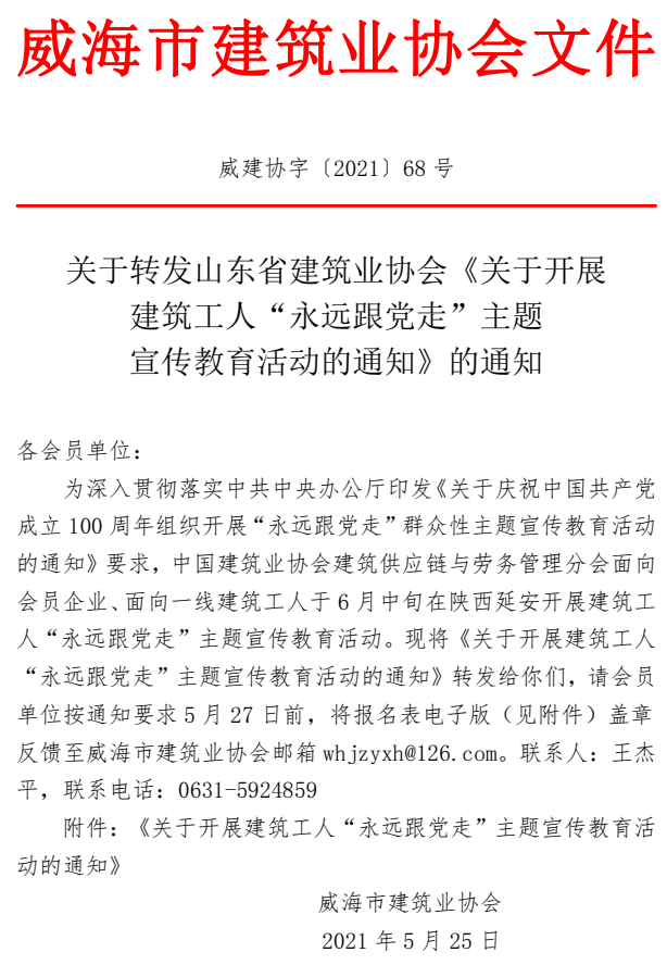 關(guān)于轉(zhuǎn)發(fā)山東省建筑業(yè)協(xié)會(huì)《關(guān)于開(kāi)展 建筑工人“永遠(yuǎn)跟黨走”主題 宣傳教育活動(dòng)的通知》的通知