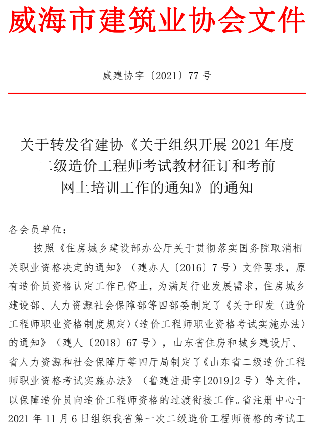 關(guān)于轉(zhuǎn)發(fā)省建協(xié)《關(guān)于組織開展2021年度 二級(jí)造價(jià)工程師考試教材征訂和考前 網(wǎng)上培訓(xùn)工作的通知》的通知