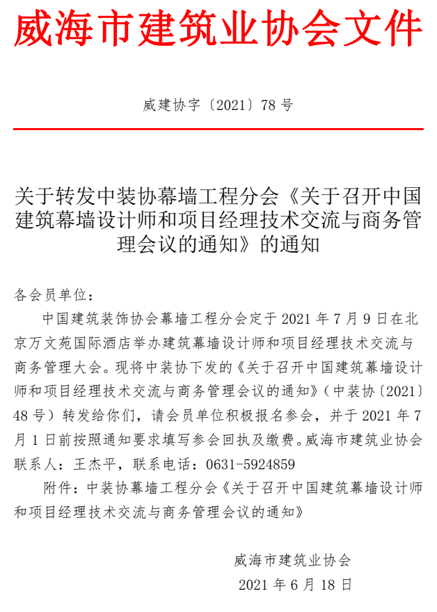 關(guān)于轉(zhuǎn)發(fā)中裝協(xié)幕墻工程分會(huì)《關(guān)于召開中國建筑幕墻設(shè)計(jì)師和項(xiàng)目經(jīng)理技術(shù)交流與商務(wù)管理會(huì)議的通知》的通知