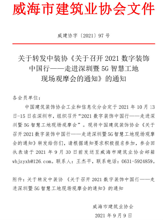 關(guān)于轉(zhuǎn)發(fā)中裝協(xié)《關(guān)于召開2021數(shù)字裝飾 中國行——走進深圳暨5G智慧工地 現(xiàn)場觀摩會的通知》的通知