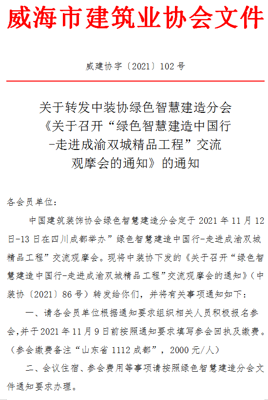 關于轉發(fā)中裝協(xié)綠色智慧建造分會《關于召開“綠色智慧建造中國行-走進成渝雙城精品工程”交流觀摩會的通知》的通知