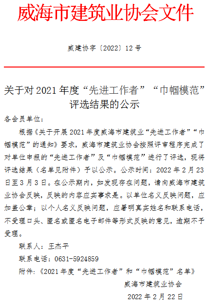 >威海市建筑業(yè)協(xié)會關(guān)于2021年度“先進工作者”“巾幗模范”評選結(jié)果的公示