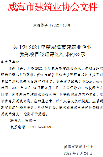 >關(guān)于對2021年度威海市建筑業(yè)企業(yè)優(yōu)秀項(xiàng)目經(jīng)理評選結(jié)果的公示