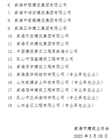 >威海市建筑業(yè)協(xié)會(huì)關(guān)于表彰2021年度威海市建筑業(yè)先進(jìn)單位的決定