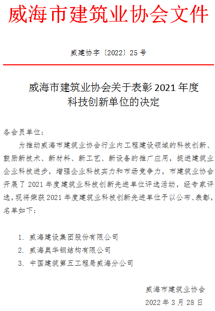 >威海市建筑業(yè)協(xié)會關于表彰2021年科技創(chuàng)新單位的決定