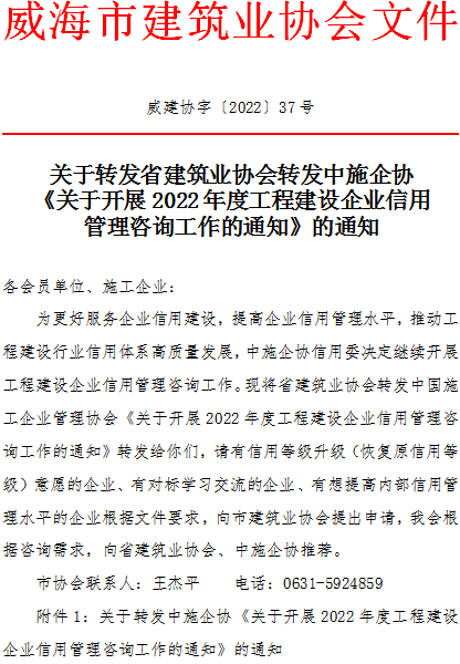 關(guān)于轉(zhuǎn)發(fā)省建筑業(yè)協(xié)會轉(zhuǎn)發(fā)中施企協(xié)《關(guān)于開展2022年度工程建設(shè)企業(yè)信用管理咨詢工作的通知》的通知