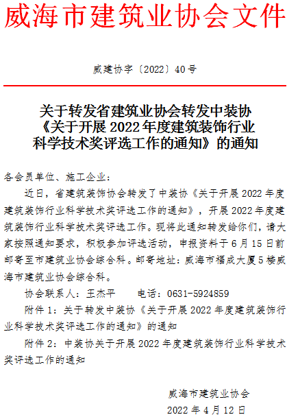 關(guān)于轉(zhuǎn)發(fā)省建筑業(yè)協(xié)會轉(zhuǎn)發(fā)中裝協(xié)《關(guān)于開展2022年度建筑裝飾行業(yè)科學技術(shù)獎評選工作的通知》的通知