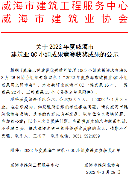 >關(guān)于2022年度威海市建筑業(yè)QC小組成果競(jìng)賽獲獎(jiǎng)成果的公示