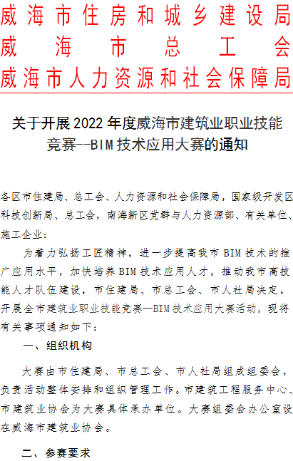 >關(guān)于開展2022年度威海市建筑業(yè)職業(yè)技能競賽--BIM技術(shù)應(yīng)用大賽的通知