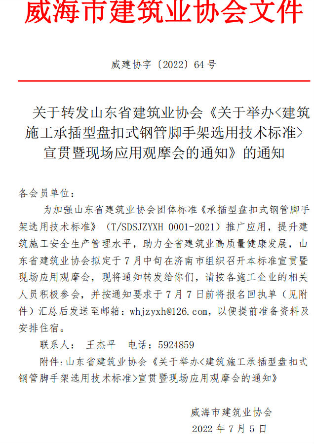 關(guān)于轉(zhuǎn)發(fā)山東省建筑業(yè)協(xié)會《關(guān)于舉辦<建筑施工承插型盤扣式鋼管腳手架選用技術(shù)標(biāo)準(zhǔn)>宣貫暨現(xiàn)場應(yīng)用觀摩會的通知》的通知