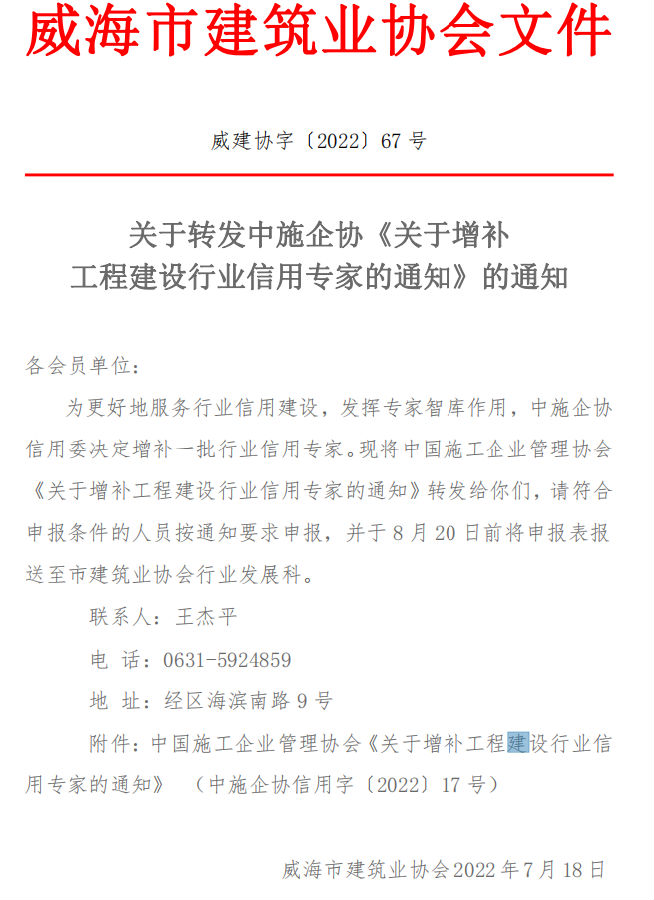 2022第67號(hào)關(guān)于轉(zhuǎn)發(fā)中施企協(xié)《關(guān)于增補(bǔ) 工程建設(shè)行業(yè)信用專家的通知》的通知