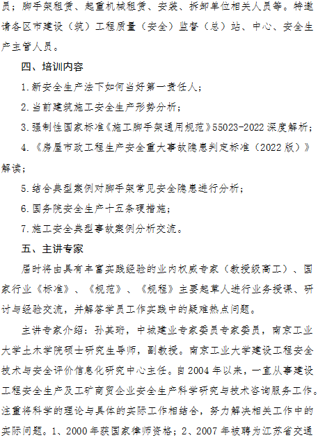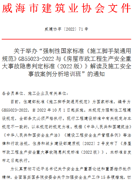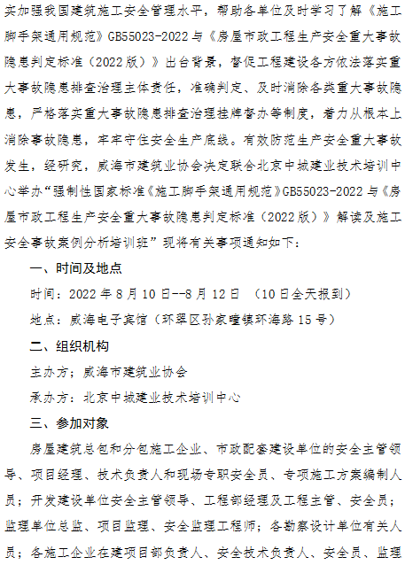 關(guān)于舉辦“強(qiáng)制性國(guó)家標(biāo)準(zhǔn)《施工腳手架通用規(guī)范》GB55023-2022與《房屋市政工程生產(chǎn)安全重大事故隱患判定標(biāo)準(zhǔn)(2022版)》解讀及施工安全事故案例分析培訓(xùn)班”的通知