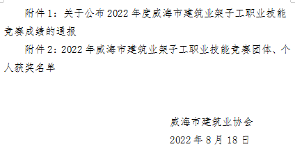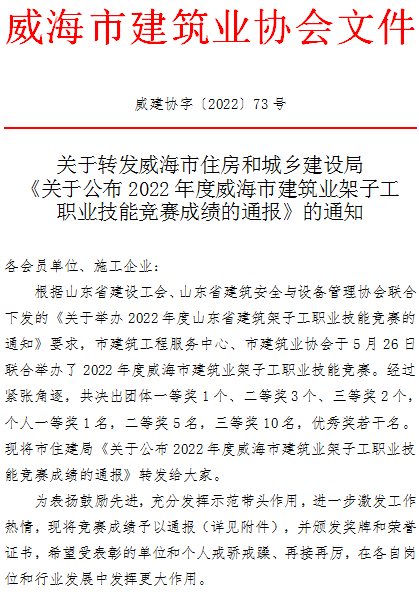 - 當(dāng)前位置:首頁 >文件公告>關(guān)于轉(zhuǎn)發(fā)威海市住房和城鄉(xiāng)建設(shè)局《關(guān)于公布2022年度威海市建筑業(yè)架子工職業(yè)技能競(jìng)賽成績(jī)的通報(bào)》的通知