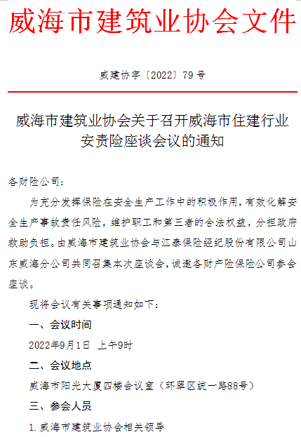 威海市建筑業(yè)協(xié)會關(guān)于召開威海市住建行業(yè)安責(zé)險座談會議的通知