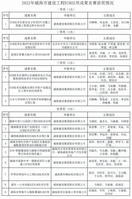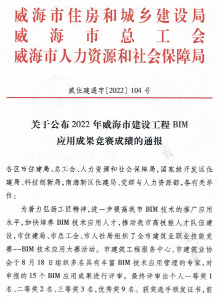 關(guān)于公布2022年威海市建設(shè)工程BIM應(yīng)用成果競賽成績的通報(bào)