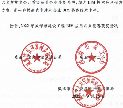 >關(guān)于公布2022年威海市建設(shè)工程BIM應(yīng)用成果競賽成績的通報(bào)