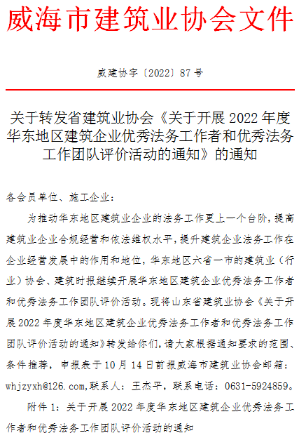關(guān)于轉(zhuǎn)發(fā)省建筑業(yè)協(xié)會(huì)《關(guān)于開(kāi)展2022年度華東地區(qū)建筑企業(yè)優(yōu)秀法務(wù)工作者和優(yōu)秀法務(wù)工作團(tuán)隊(duì)評(píng)價(jià)活動(dòng)的通知》的通知