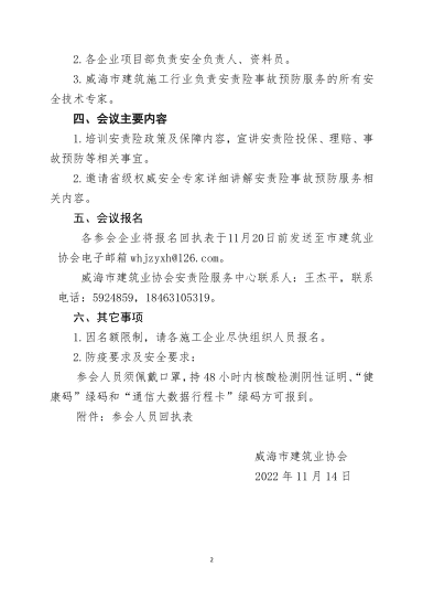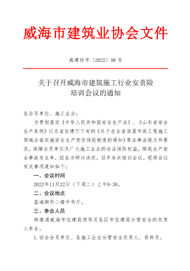 關(guān)于召開威海市建筑施工行業(yè)安責(zé)險 培訓(xùn)會議的通知