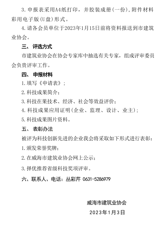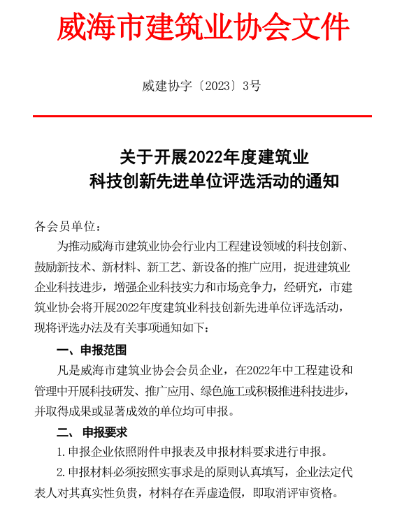 威海市建筑業(yè)協(xié)會(huì)關(guān)于評(píng)選 2022年度威海市建筑業(yè)先進(jìn)單位的通知