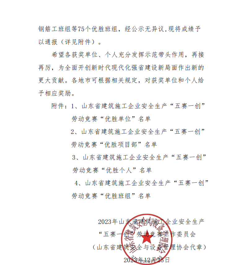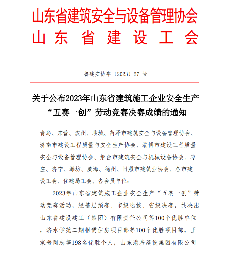 在山東省建筑安全與設(shè)備管理協(xié)會、山東省建設(shè)工會組織的2023年度山東省建筑施工企業(yè)安全生產(chǎn)“五賽一創(chuàng)”勞動競賽活動中,我市4家企業(yè)榮獲“優(yōu)勝單位”,5個項目部獲得優(yōu)勝項目部,13名個人獲得“優(yōu)勝個人”,5個班組獲得“優(yōu)勝班組”稱號。