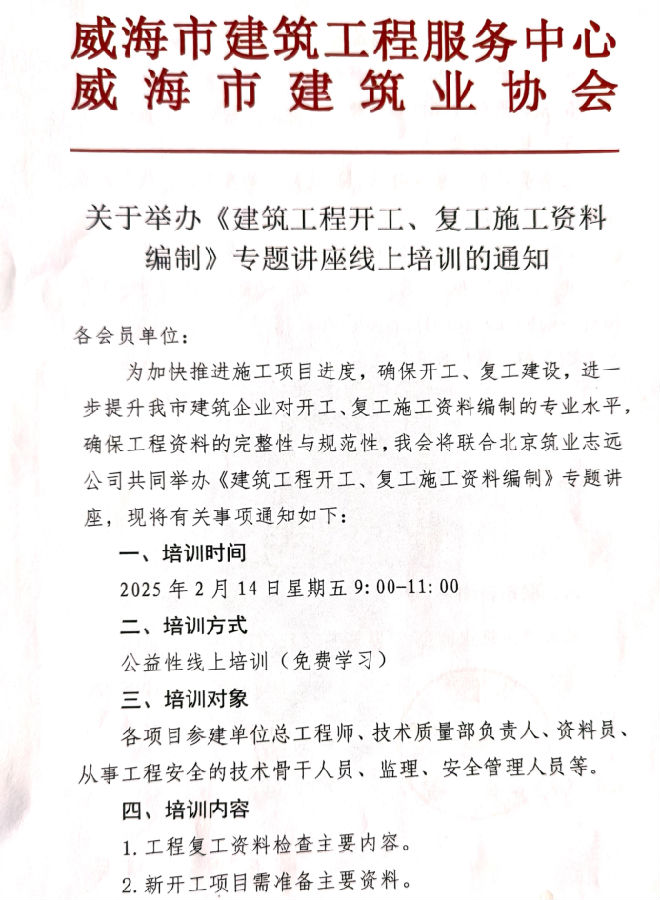 關(guān)于舉辦《建筑工程開工、復(fù)工施工資料編制》專題講座線上培訓(xùn)的通知