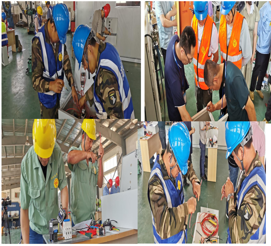 在實(shí)際操作比賽現(xiàn)場(chǎng),選手們手握螺絲刀和電工鉗,沉著冷靜地進(jìn)行電纜、導(dǎo)線的識(shí)別及導(dǎo)線的連接。他們不僅要完成對(duì)給定電纜、導(dǎo)線進(jìn)行材料、型號(hào)、截面積等項(xiàng)目的識(shí)別,按要求作多股銅線的連接,還要對(duì)照現(xiàn)場(chǎng)給定應(yīng)用場(chǎng)景、電氣回路圖和原理圖,選擇匹配的電器元件在空配電箱內(nèi)組裝,形成控制回路。