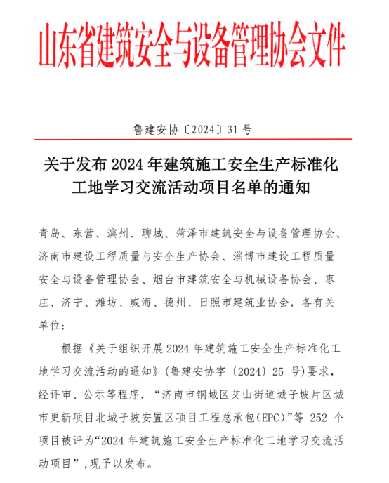 近日,山東省建筑安全與設(shè)備管理協(xié)會(huì)下發(fā)《關(guān)于發(fā)布2024年建筑施工安全生產(chǎn)標(biāo)準(zhǔn)化工地學(xué)習(xí)交流活動(dòng)項(xiàng)目名單的通知》,威海市共有9個(gè)項(xiàng)目入選。